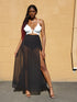 Two toned maxi dress with spaghetti straps and low cut neckline. Thigh high slits and zippered back
